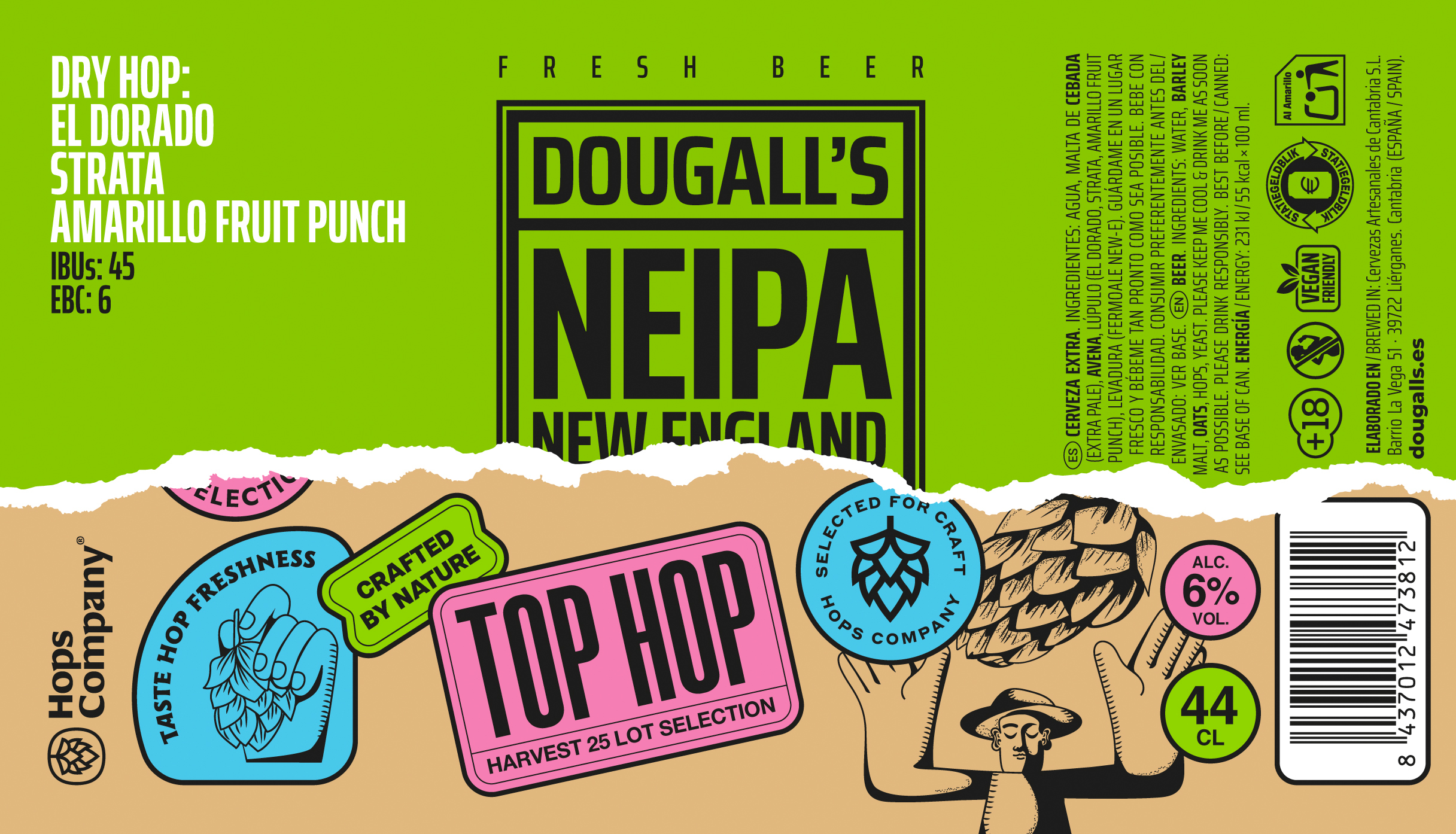 Una NEIPA que nace del encuentro entre DouGall’s y Hops Company, especialistas en la selección de los mejores lúpulos del mundo. Rubia, turbia y con cuerpo sedoso, destapa un torrente de aromas jugosos: guayaba, nectarina, cítricos y un toque resinoso que recuerda al campo tras la lluvia. En boca, el trago es suave y envolvente, con ese equilibrio entre lo frutal y lo herbal que tanto nos gusta. Un homenaje al lúpulo fresco, trabajado a conciencia desde su origen.